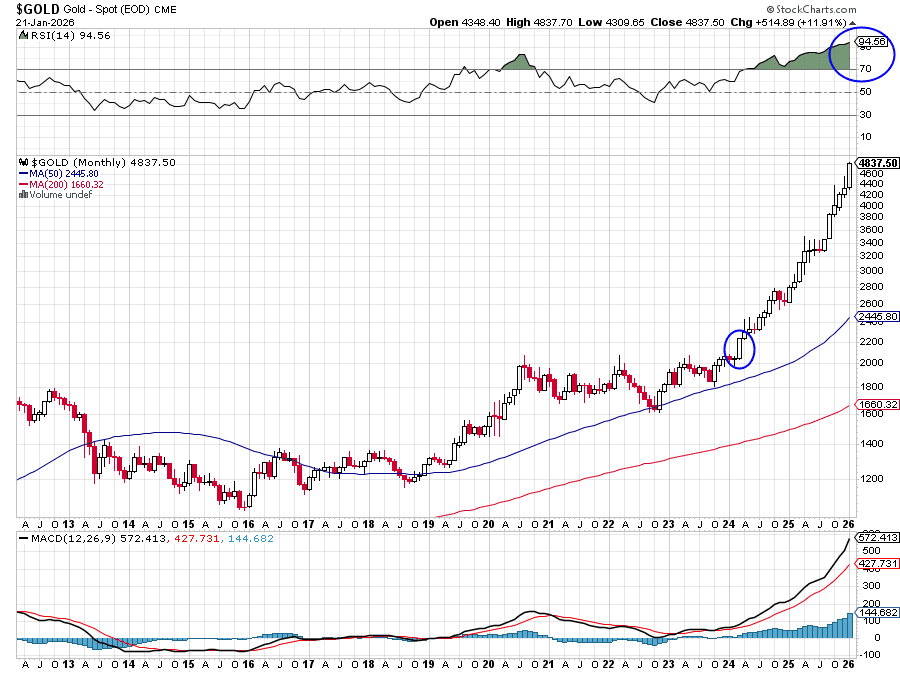 *Note the other blue circle in the upper right as gold hit's a mid 90's RSI on this monthly chart